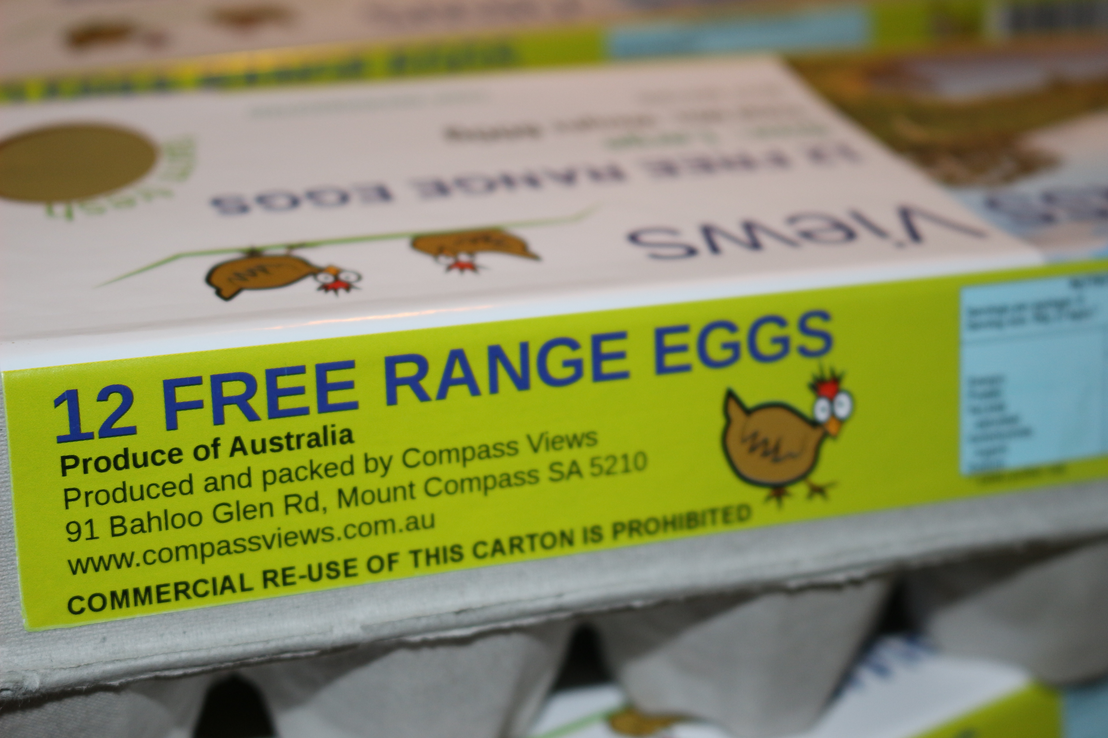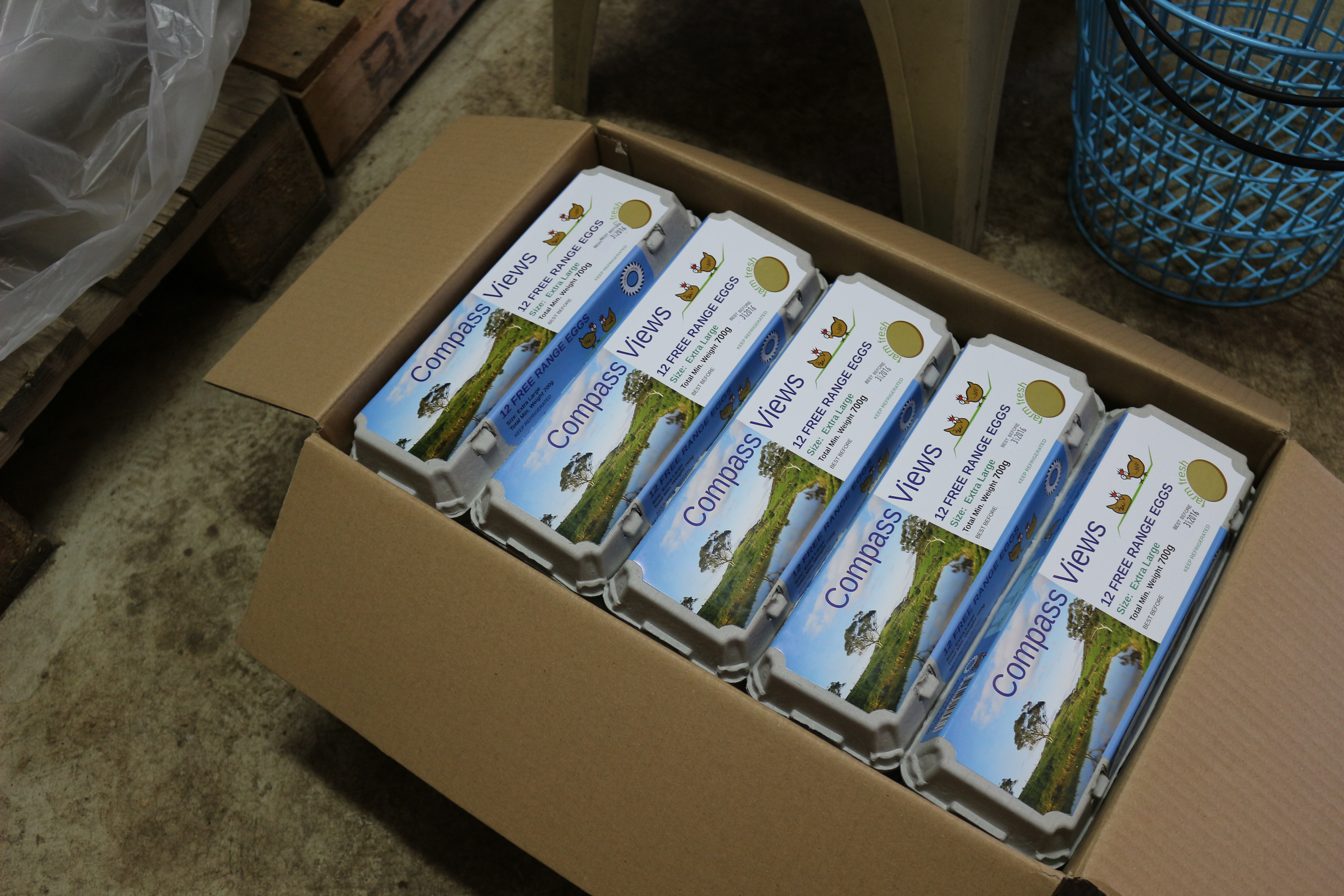 Compass Views egg production farm, Mount Compass 70kms South of Adelaide, sells to locals & farmers markets. The Logo design and colour coded egg cartons (shows different egg weights) was made to look organic friendly, andEggs homely. Eventually the design was adapted for sign-age, clothing, bags, hats and Stationery.